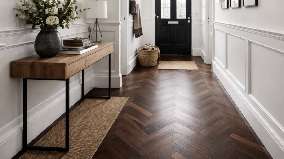 Darker or mid-tone woods are practical choices for hallways, as they help disguise everyday wear while maintaining a refined appearance.